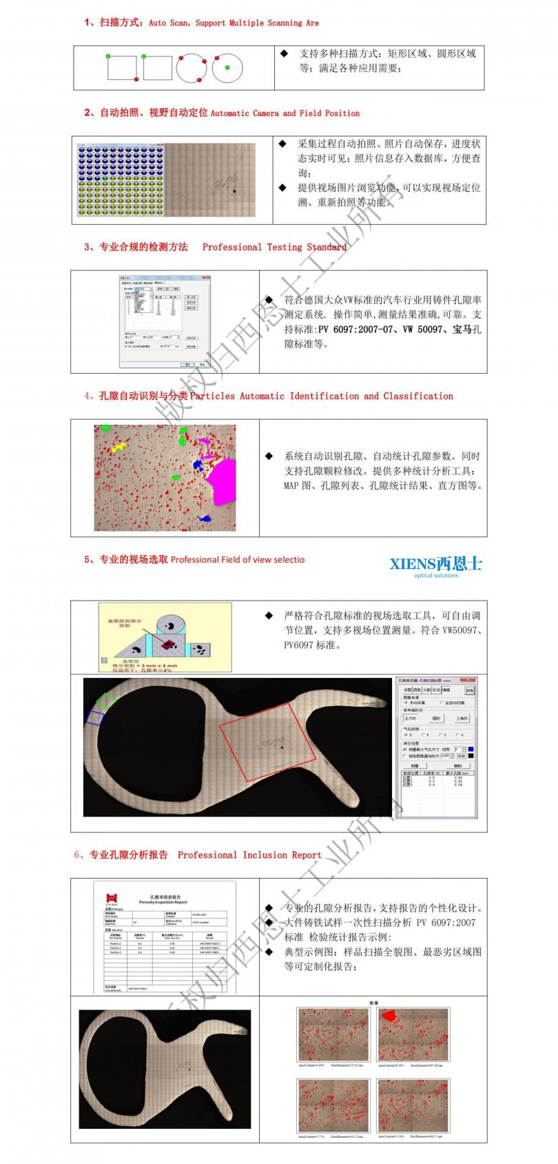AP53M孔隙率系統(tǒng)依然是基于高性能光學(xué)顯微鏡打造的全自動(dòng)的分析解決方案,主要用于分析鋁合金和鑄鐵等鑄件的鑄造孔隙分析。同時(shí)也適用于其他材料的孔隙分析。全自動(dòng)的檢驗(yàn)分析過程:自動(dòng)掃描整個(gè)試樣、自動(dòng)拍照,孔隙自動(dòng)識(shí)別、統(tǒng)計(jì)、分析,自動(dòng)孔隙分析、自動(dòng)生成專業(yè)分析報(bào)告;符合德國大眾VW標(biāo)準(zhǔn)的汽車行業(yè)用孔隙率測定系統(tǒng). 操作簡單,測量結(jié)果準(zhǔn)確, 可靠。支持PV 6097:2007、VW 50097等標(biāo)準(zhǔn),并支持企業(yè)自定義標(biāo)準(zhǔn)。