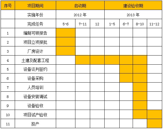 項(xiàng)目總投資主要來(lái)自項(xiàng)目發(fā)起公司自籌資金,按照計(jì)劃在2012年3月份前完成項(xiàng)目申報(bào)審批工作。預(yù)計(jì)項(xiàng)目總投資資金到位時(shí)間在2011年4月底。整個(gè)項(xiàng)目建設(shè)期內(nèi),主要完成項(xiàng)目可研報(bào)告編制、項(xiàng)目備案、土建及配套工程、人員招聘及培訓(xùn)、設(shè)備簽約、設(shè)備生產(chǎn)、設(shè)備運(yùn)行及驗(yàn)收等工作。