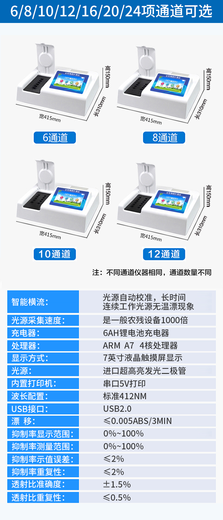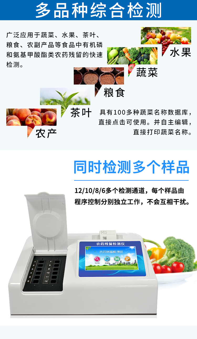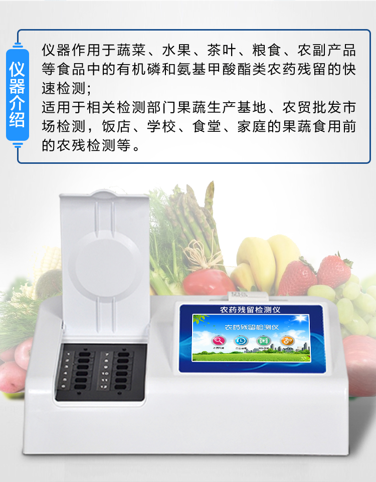 檢測標(biāo)準(zhǔn):依據(jù)國家標(biāo)準(zhǔn)方法(GB/T5009.199-2003)以及世界衛(wèi)生組織WHO、世界糧農(nóng)組織FAO殘留農(nóng)藥檢測標(biāo)準(zhǔn)、世界環(huán)境保護(hù)局EPA參照攝入量等要求來設(shè)計(jì)。采用酶YZ率比色法對水果、蔬菜等農(nóng)林產(chǎn)品中有機(jī)磷和氨基甲酸酯類農(nóng)藥含量進(jìn)行快速準(zhǔn)確的檢測。
