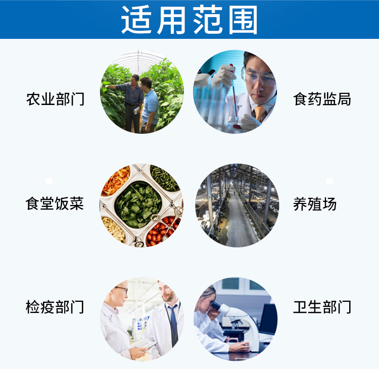 廣泛應(yīng)用于主要用于蔬菜、水果、茶葉、糧食、農(nóng)副產(chǎn)品等食品中有機(jī)磷和氨基甲酸酯類農(nóng)藥殘留的快速檢測;此外還可用于果蔬茶生產(chǎn)基地和農(nóng)貿(mào)批發(fā)銷售市場現(xiàn)場檢測,餐館、學(xué)校、食堂、家庭果蔬加工前的速測等。