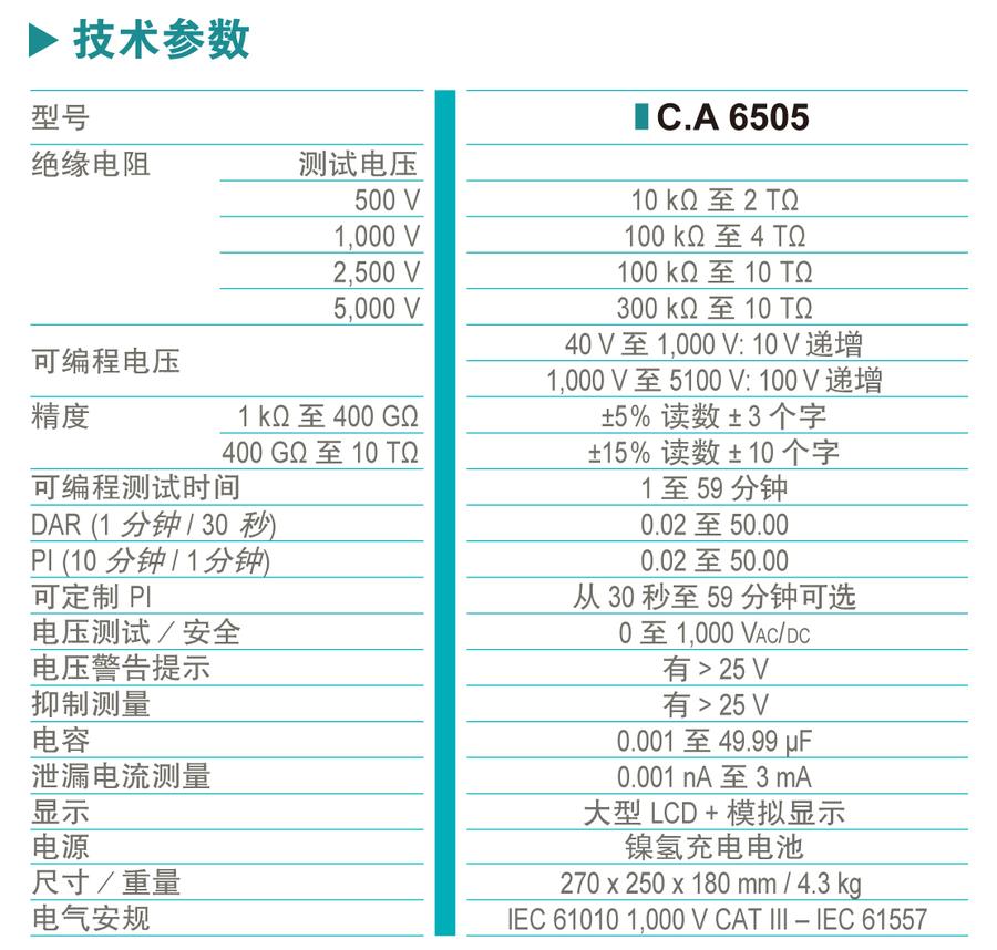 法國CA絕緣電阻測試儀C.A 6505關(guān)鍵指標(biāo)