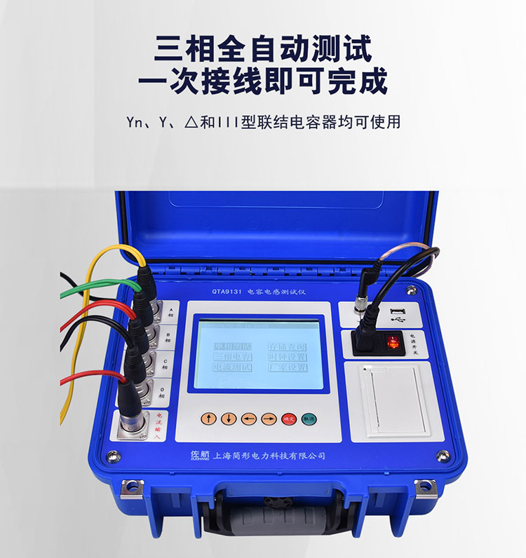 儀器具有三相電源輸出及接口,可對三相Y型聯(lián)結(jié)電容器、三相Yn型聯(lián)結(jié)電容器、三相△型聯(lián)結(jié)電容器、三相III型聯(lián)結(jié)電容器進行一次接線,即可完成三相電容測試,并對分相電容分別進行測試計算,簡單、方便,大大提高了現(xiàn)場使用人員的工作效率。